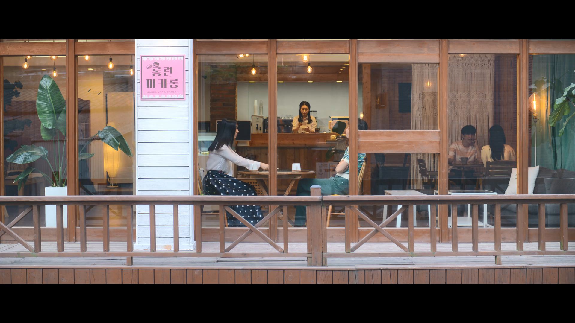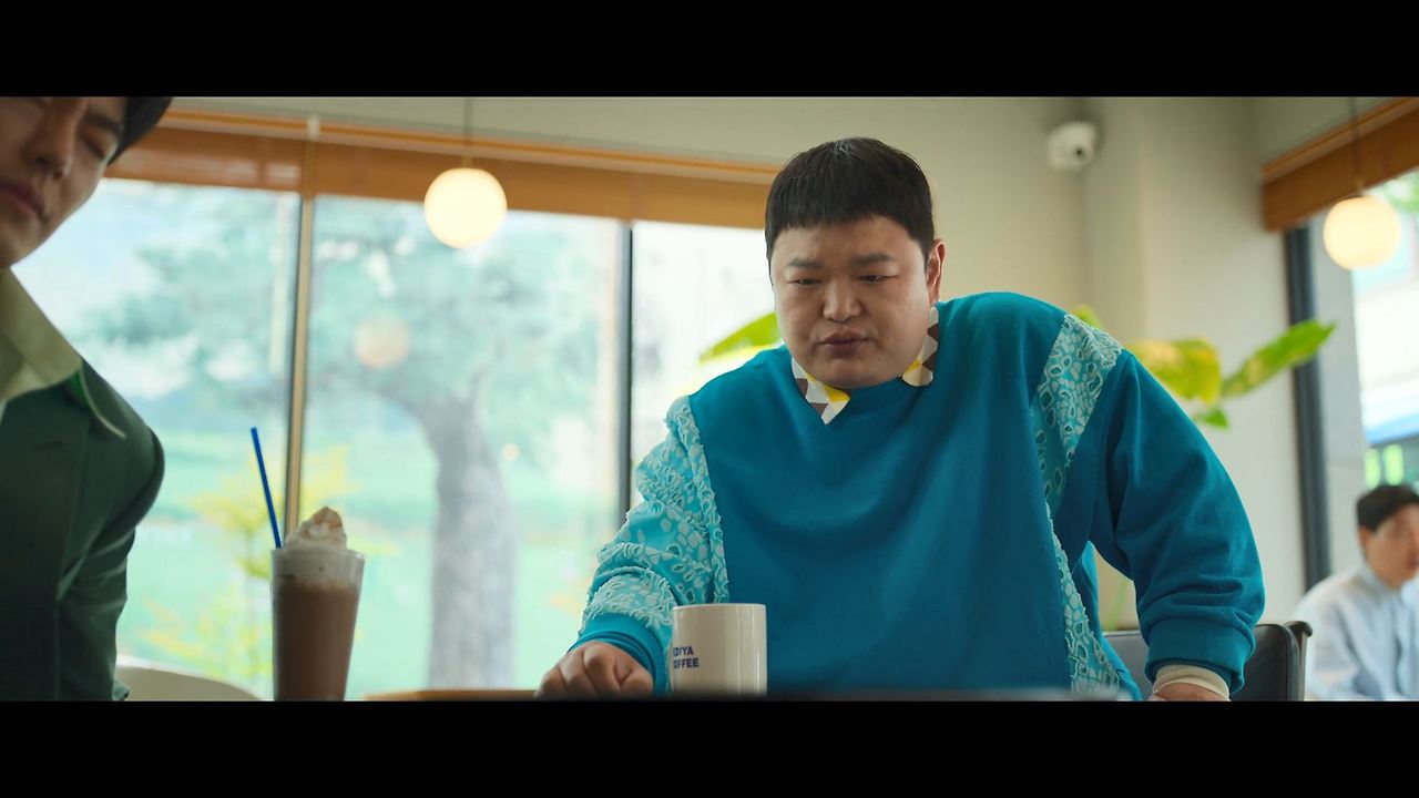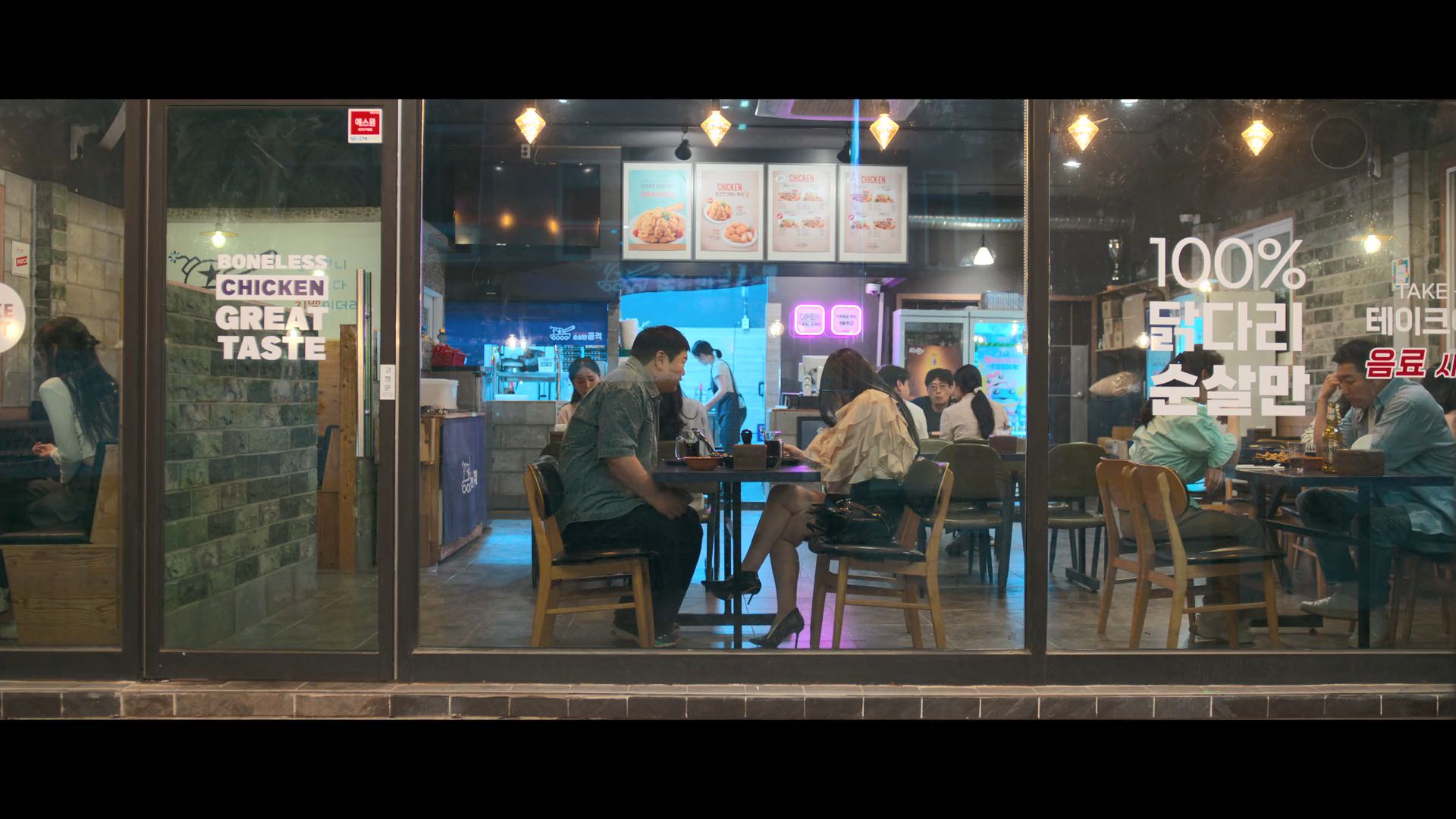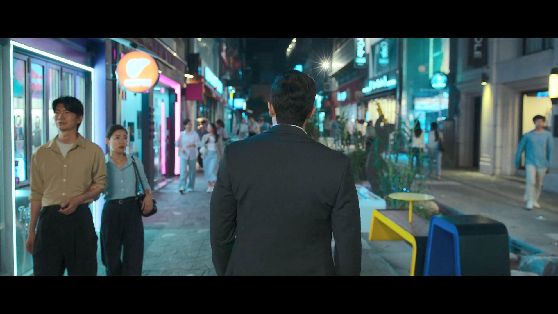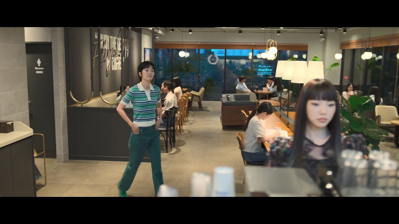 화려한 도심 속 카페에서 벌어지는 긴장감 넘치는 장면,