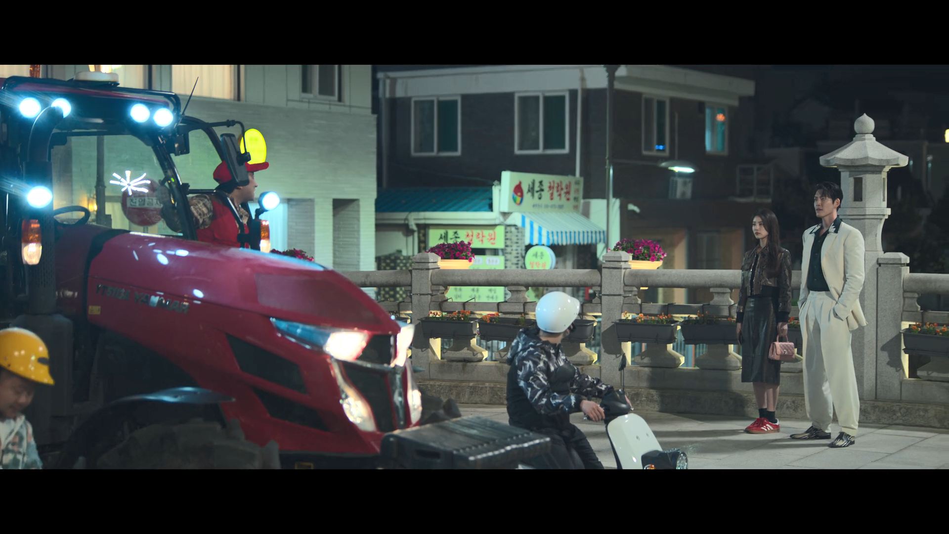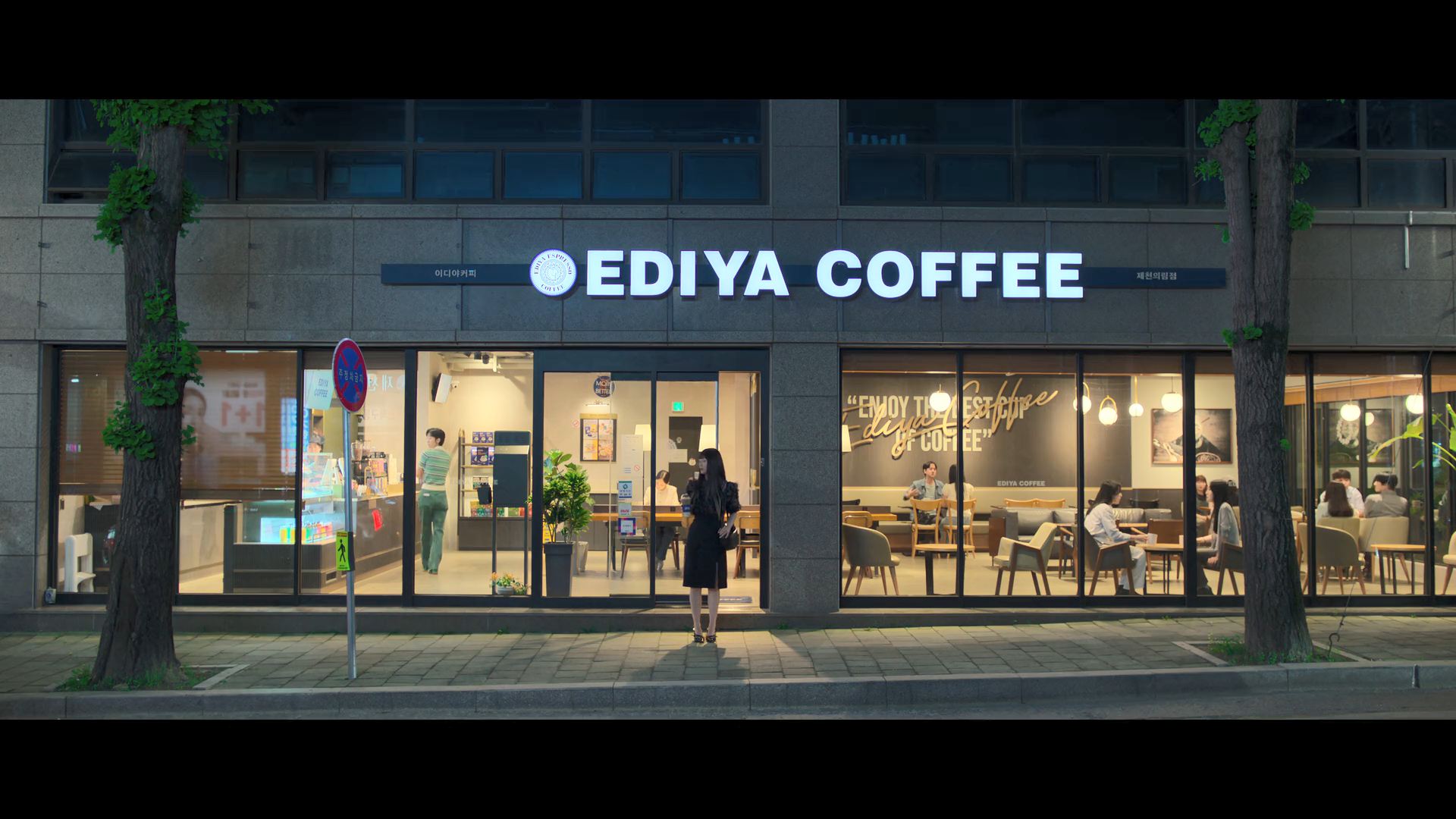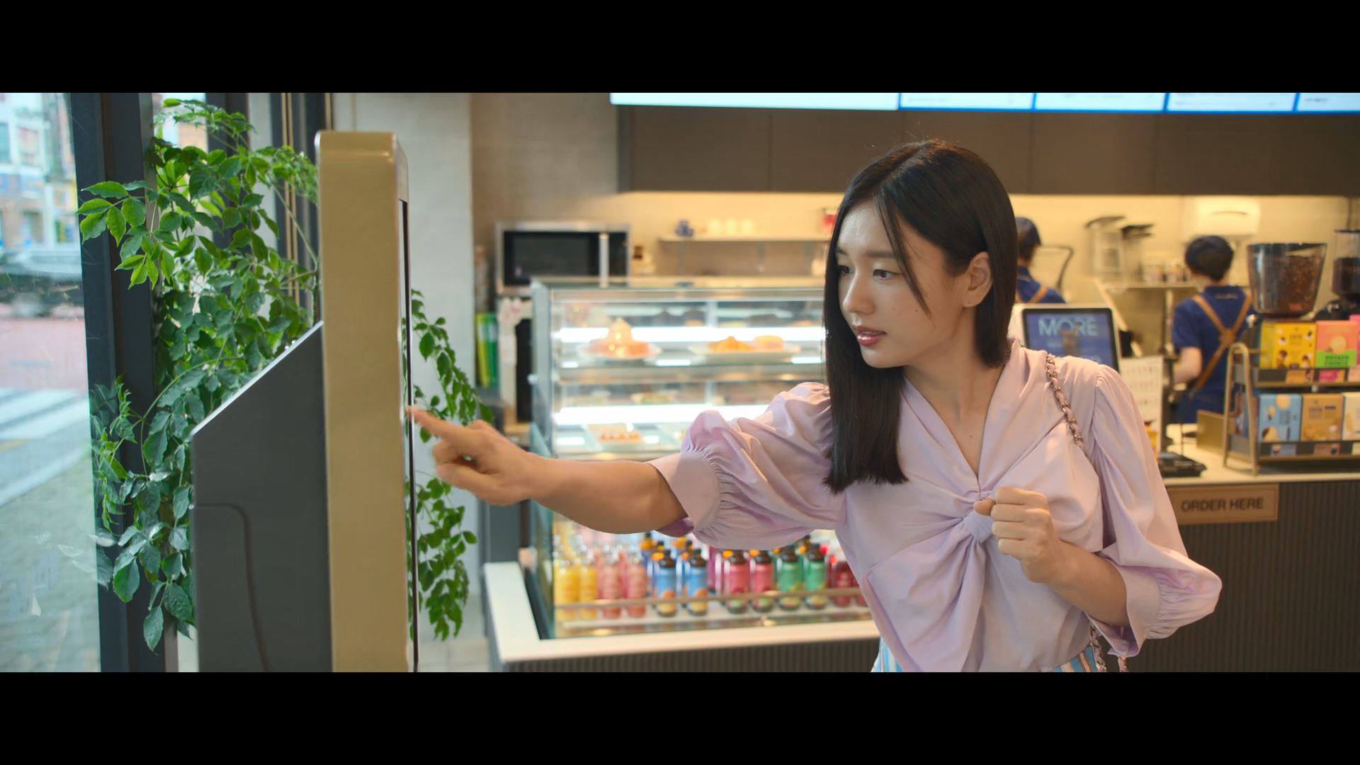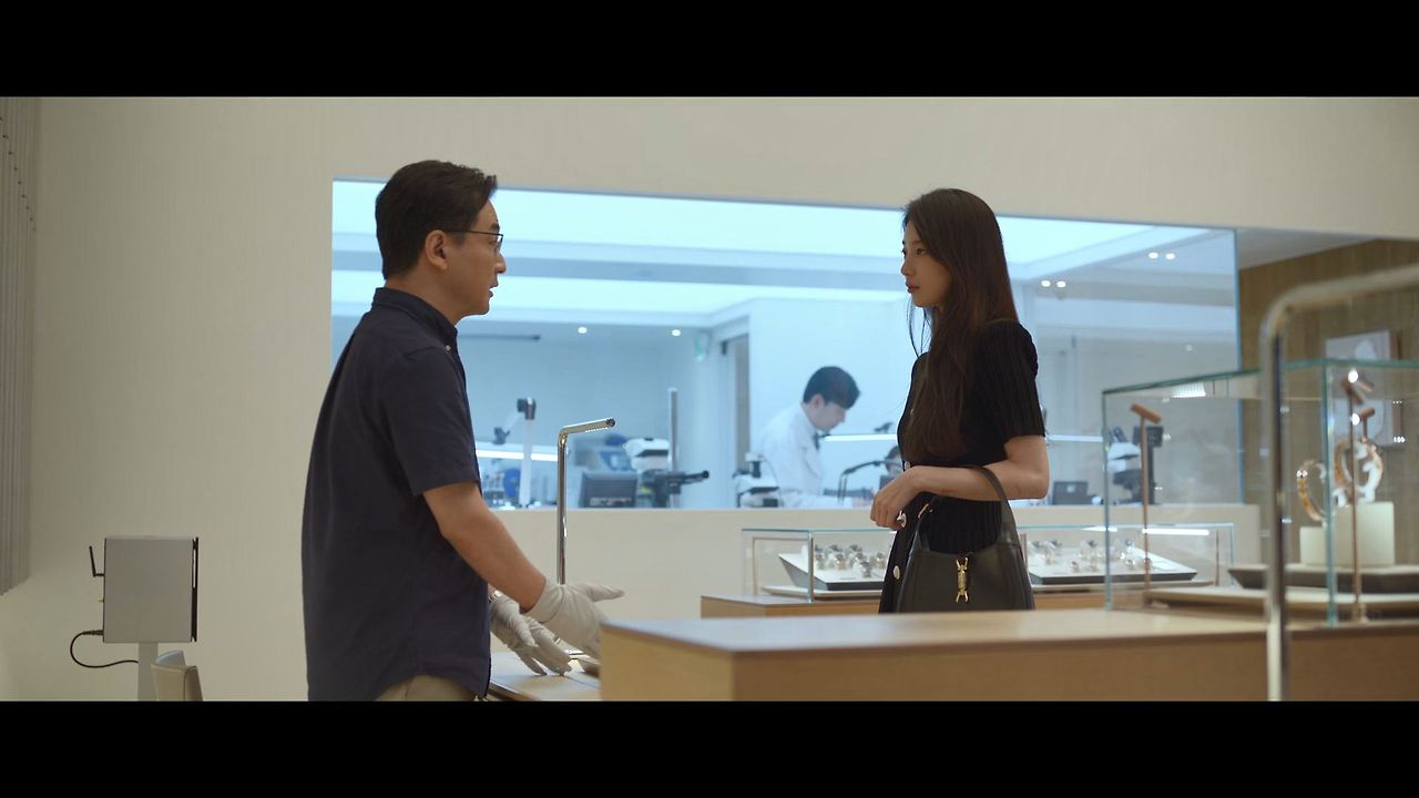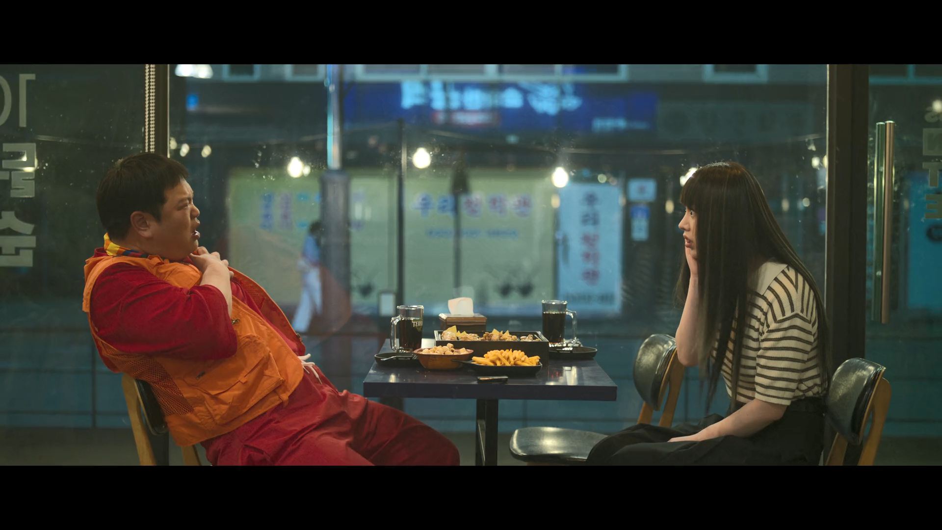 화려한 도심 속 카페에서 벌어지는 긴장감 넘치는 장면,