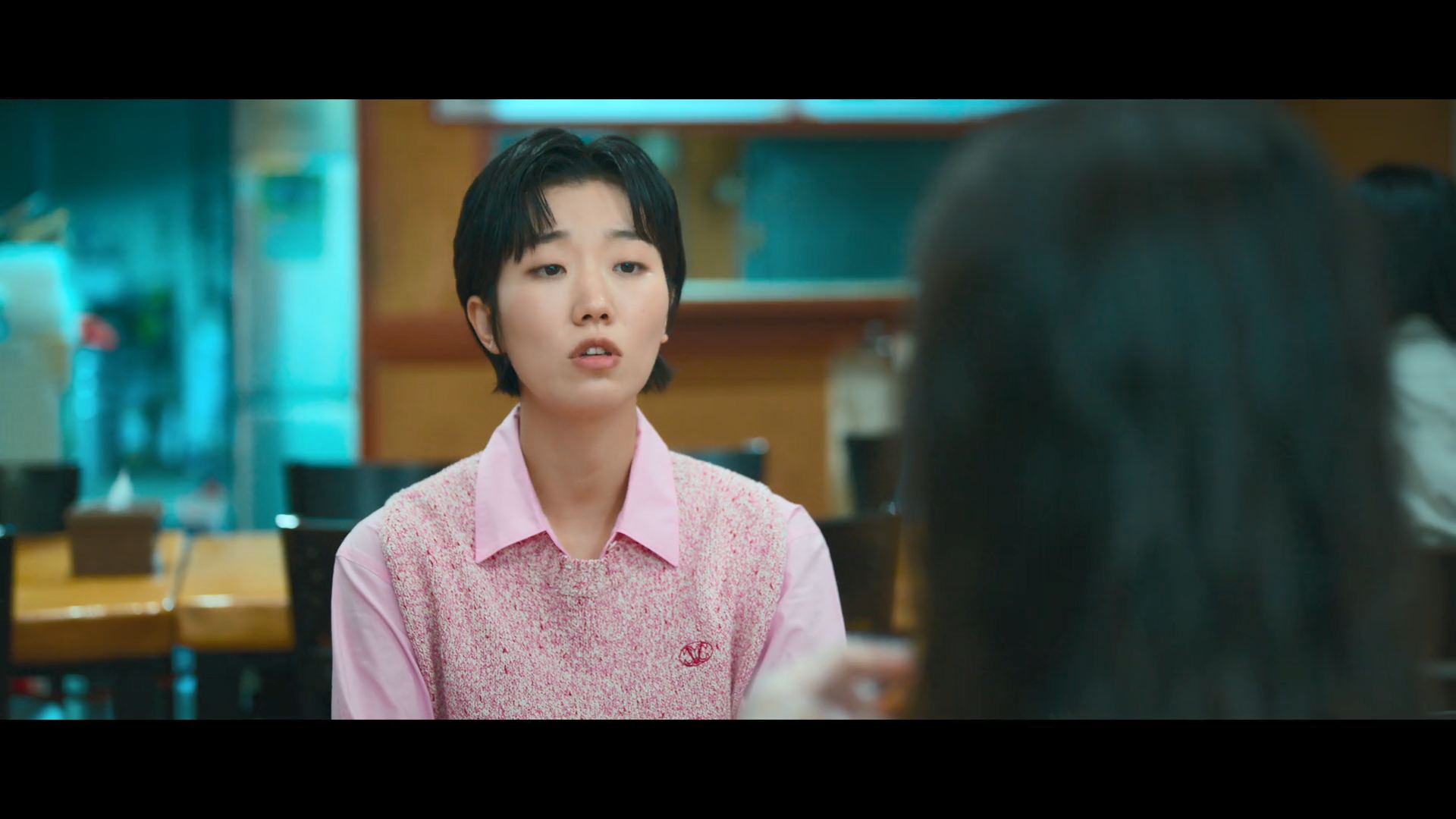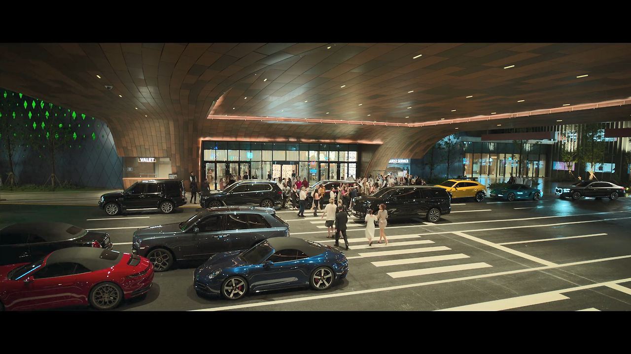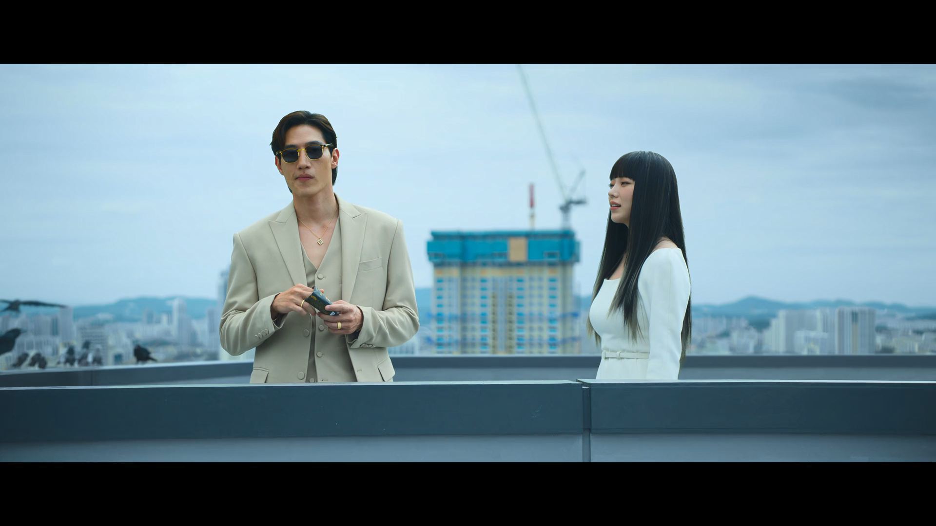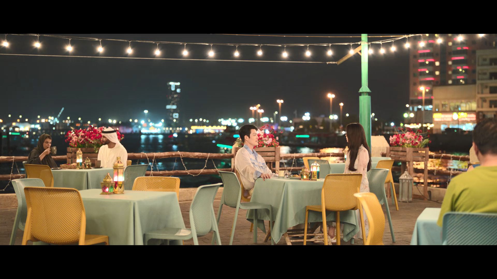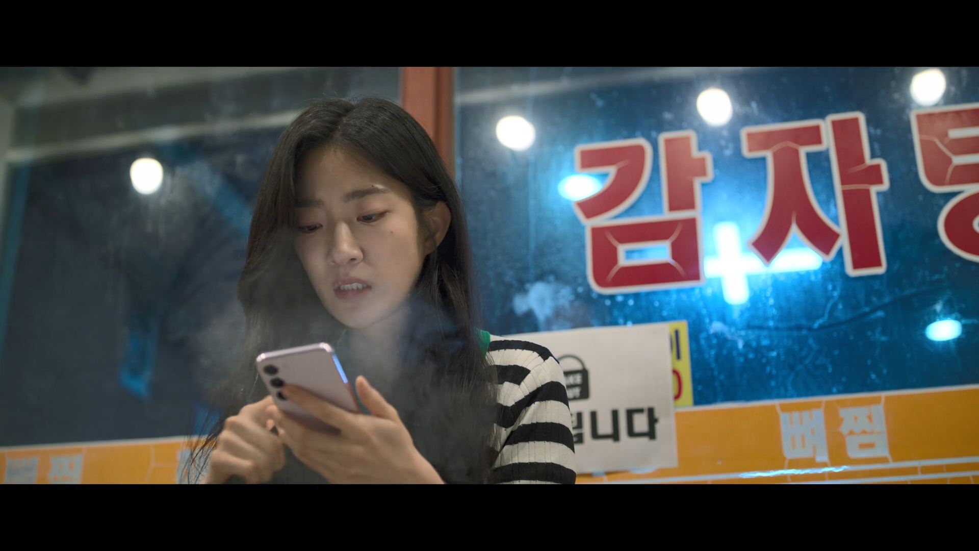 화려한 도심 속 카페에서 벌어지는 긴장감 넘치는 장면,