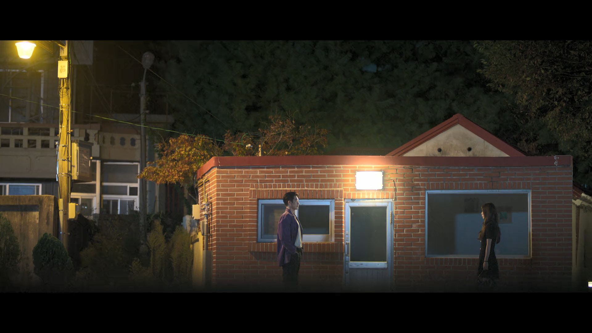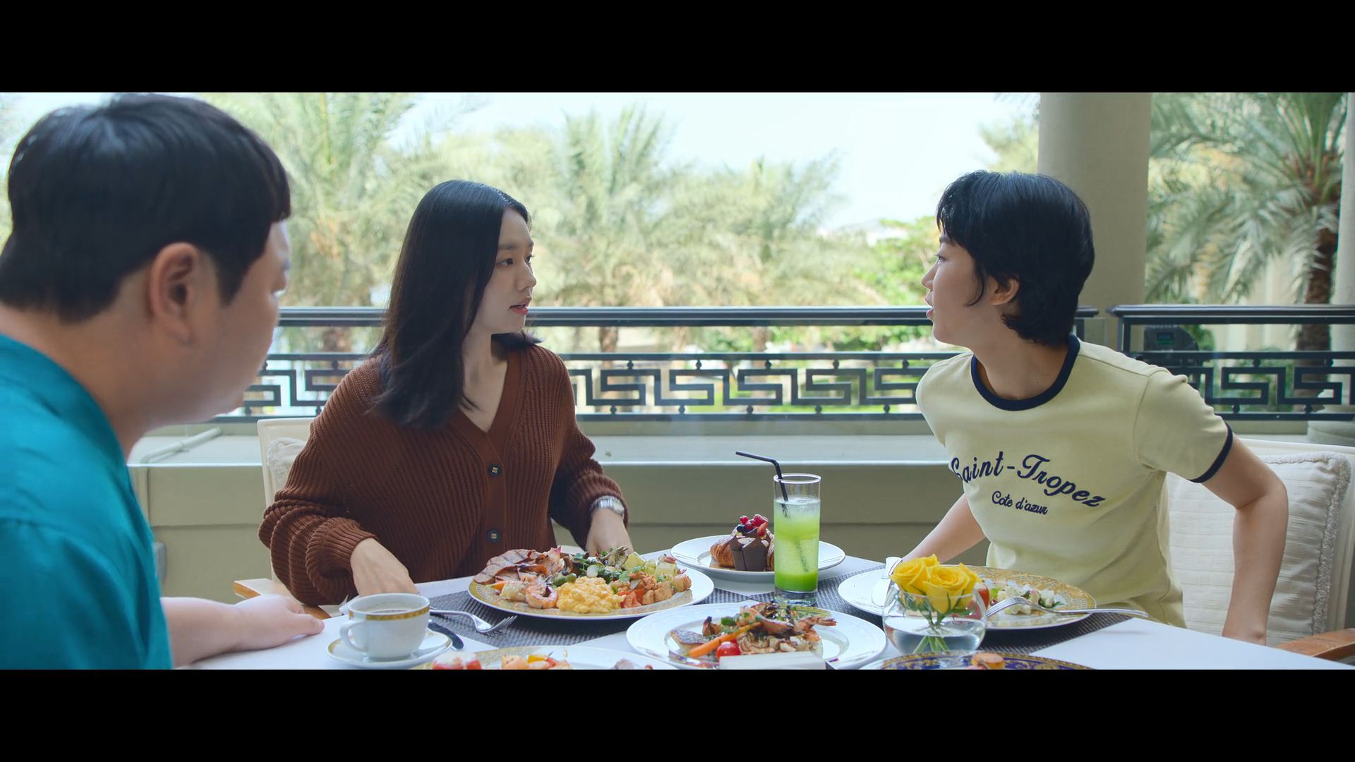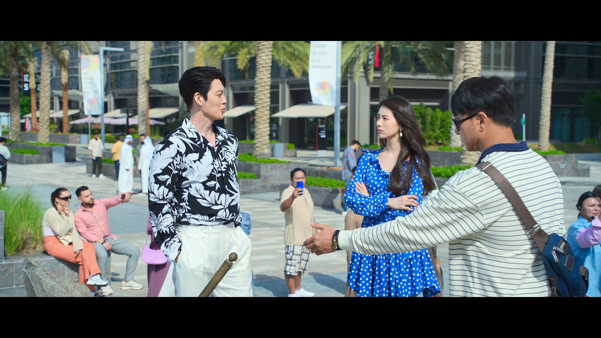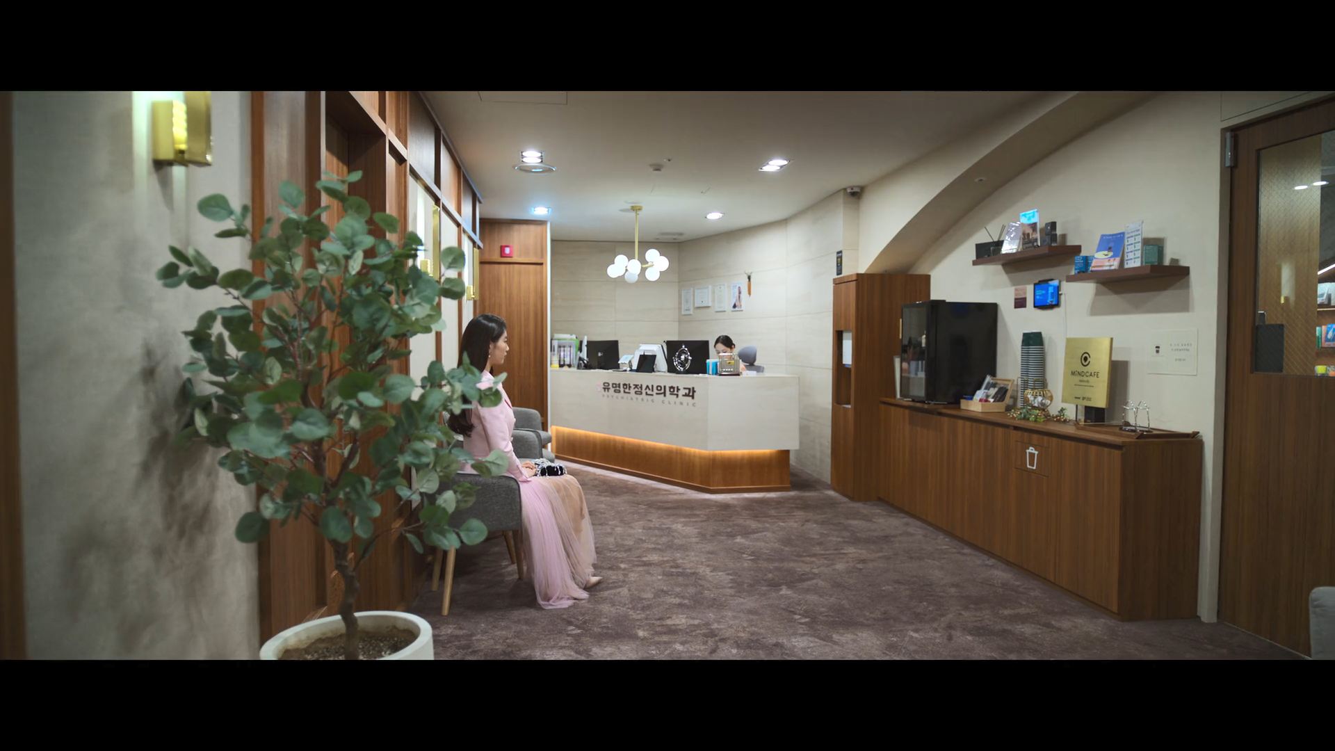 화려한 도심 속 카페에서 벌어지는 긴장감 넘치는 장면,